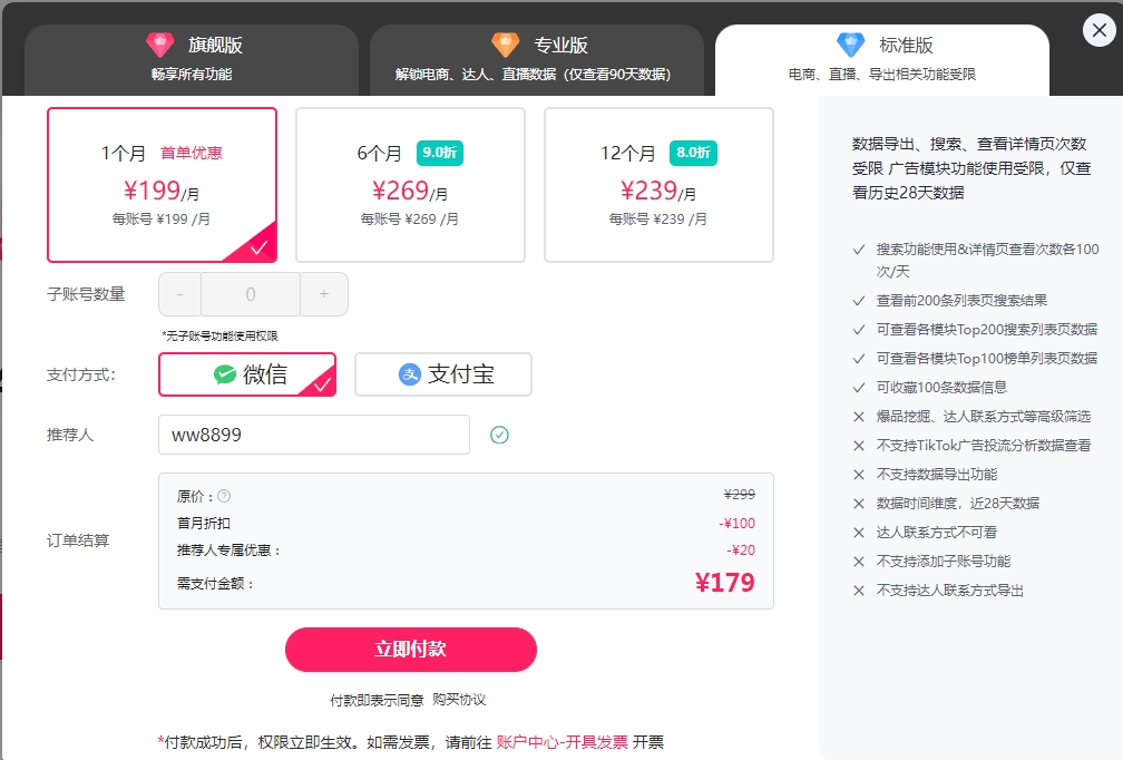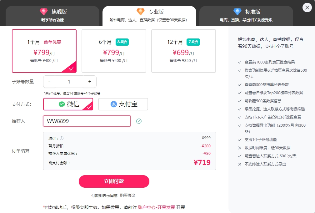 推荐人:ww8899 近日,fastmoss官方在宣传中推出,只要在官网购买会员时填上推荐人:ww8899,即可享受10%以上优惠。(具体优惠金额以官方为准) 这是采取自有账号官网直接登录,自主购买即可,安全可靠!同是也告知广大网友别在第三方平台购买,以防被诈骗、账号失效、不定时掉线、数据错乱等情况。 首先你进入fastmoss后台之后找到这个购买页面 https://www.fastmoss.com/zh/vips 你在这个推荐人这栏再把推荐人专属折扣码:ww8899输入进去(手动输入),就可以在原优惠基础上再额外享受10%以上专属优惠。